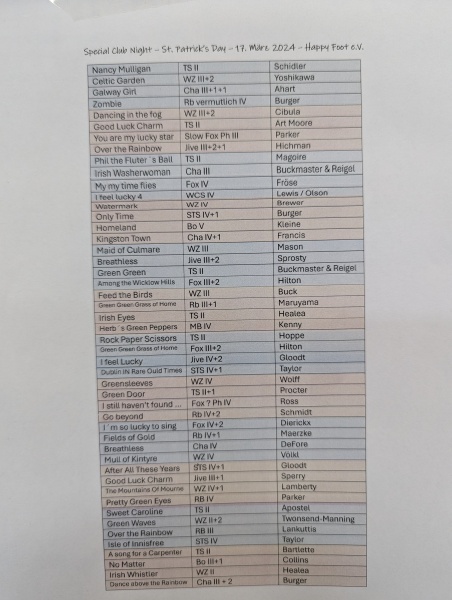 Bildergalerie Hier findest Du einige Bilder … Mit einem Klick auf das Bild oder die Überschrift öffnet sich die jeweilige Bildergalerie. Tanzaktivitäten » St Patricks Day 2024 Zeige als Diashow 1 2 ►